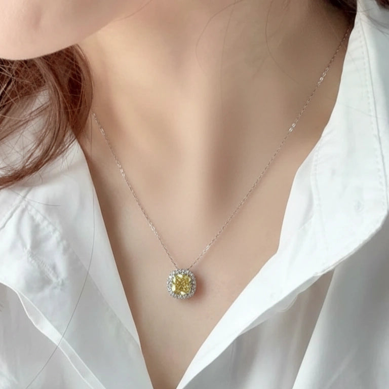 Cushion Canary Yellow Moissanite Halo Pendant in 14K White Gold